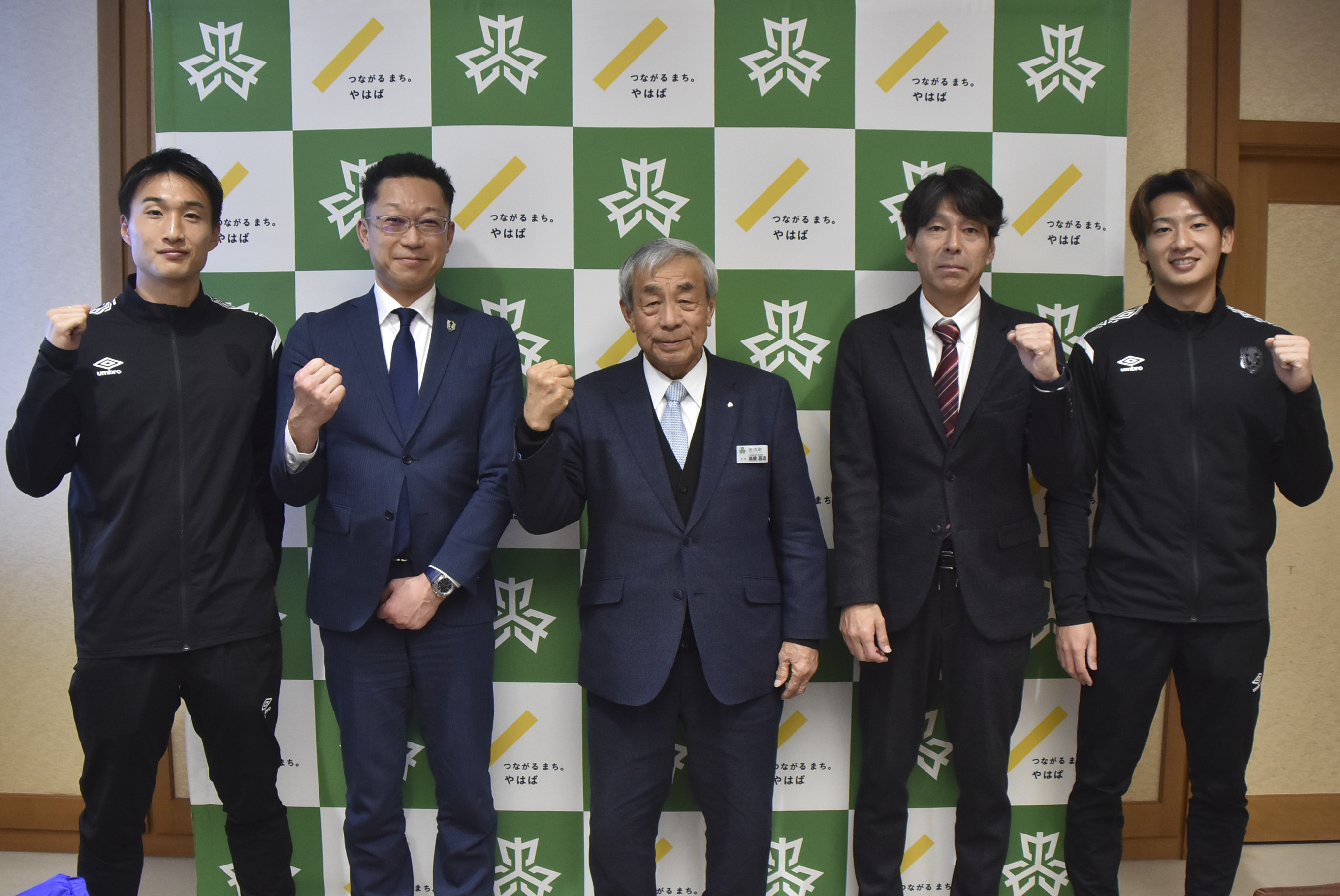 【写真(左から):柳下大樹選手、坂本社長、高橋町長、菊池監督、弓削翼選手】