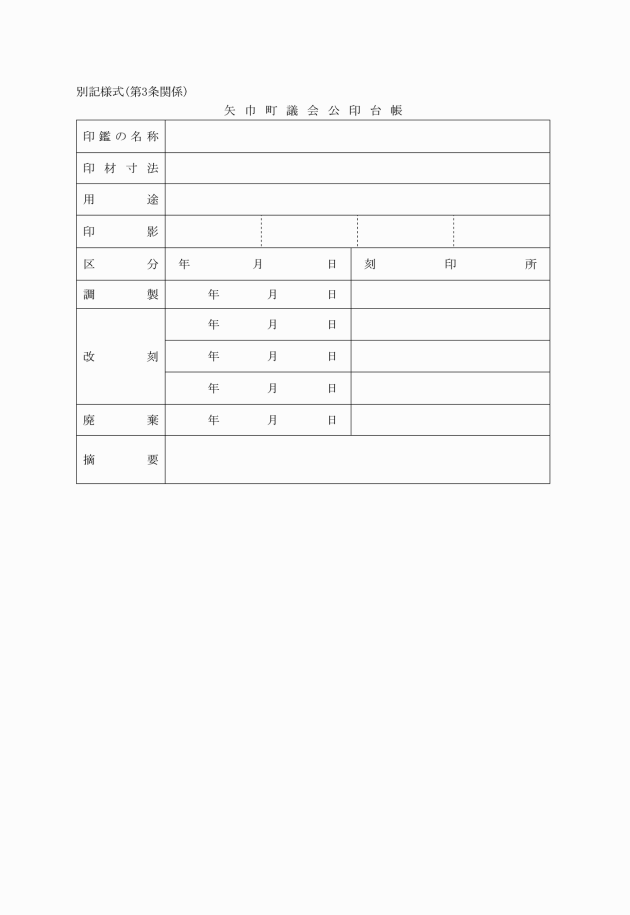 4 公印管理者は、別記様式の公印台帳を備え、公印の新調、改刻、廃止その他必要な事項を記載しなければならない。