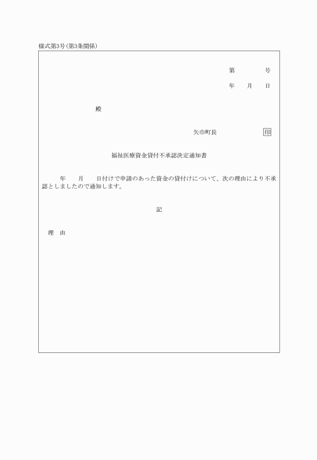 第2条 医療費助成事業の受給者等で、医療機関等に対し支払う医療費の一部負担金(以下「資金」という。)の貸付けを受けようとする者は、福祉医療資金借入申請書(様式第1号)に健康保険法(大正11年法律第70号)、国民健康保険法(昭和33年法律第192号)その他医療に関する法令等に規定する一部負担金にかかる請求書の写しを添えて町長に提出しなければならない。