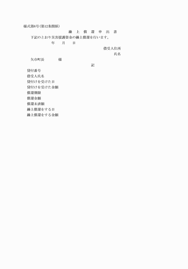 第12条 繰上償還しようとするものは、繰上償還申出書(様式第6号)を町長に提出するものとする。
