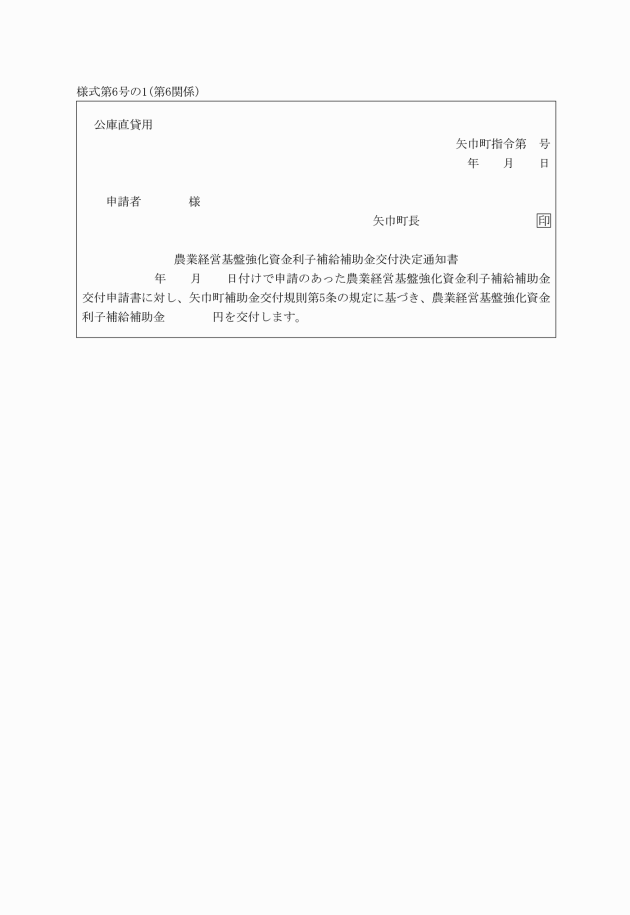 第1 農業者の効率的かつ安定的な農業経営を支援するため、農業経営基盤強化資金(株式会社日本政策金融公庫法(平成19年法律第57号)別表第5の第1号の(1)に定める資金をいう。以下同じ。)を借り入れ、町長があらかじめ承認した農業者に対し、予算の範囲内で、矢巾町補助金交付規則(昭和37年矢巾町規則第1号)及びこの告示により利子補給補助金を交付する。