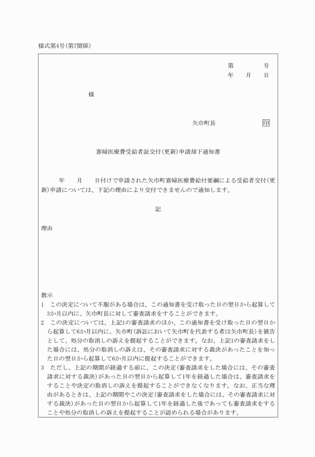 第7 町長は、第6の規定により受給者証交付(更新)申請書の提出があった場合において、この告示による医療費の給付の適否について審査を行わなければならない。