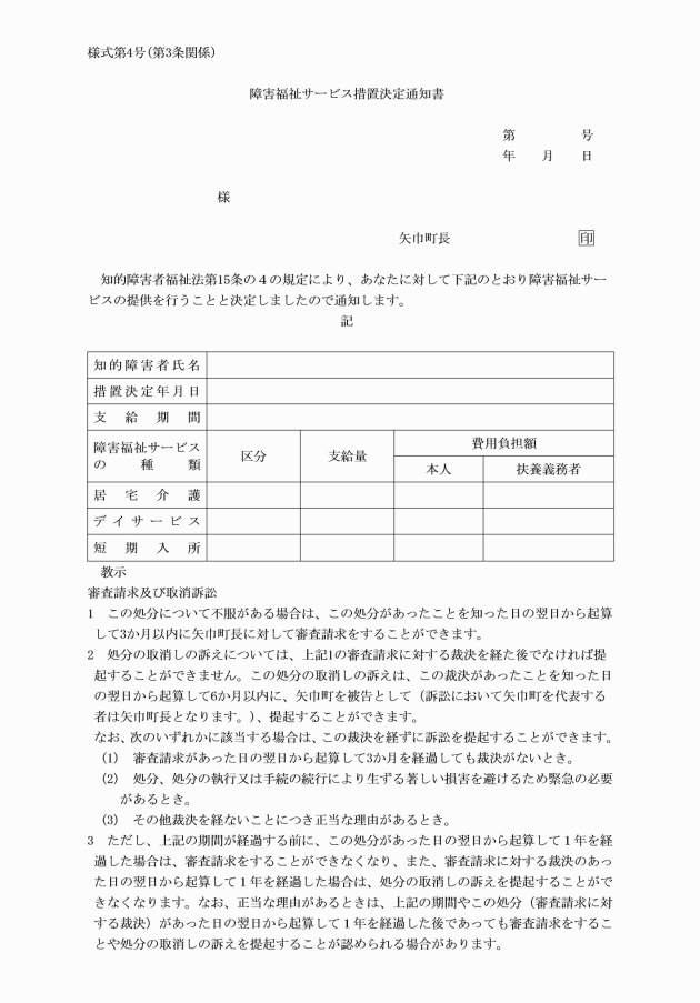 第4条 町長は、法第16条第1項第2号の規定による措置(以下「障害者支援施設等への入所の措置」という。)を採ろうとするときは、必要に応じ、第4条の規定により更生相談所の判定を求めなければならない。