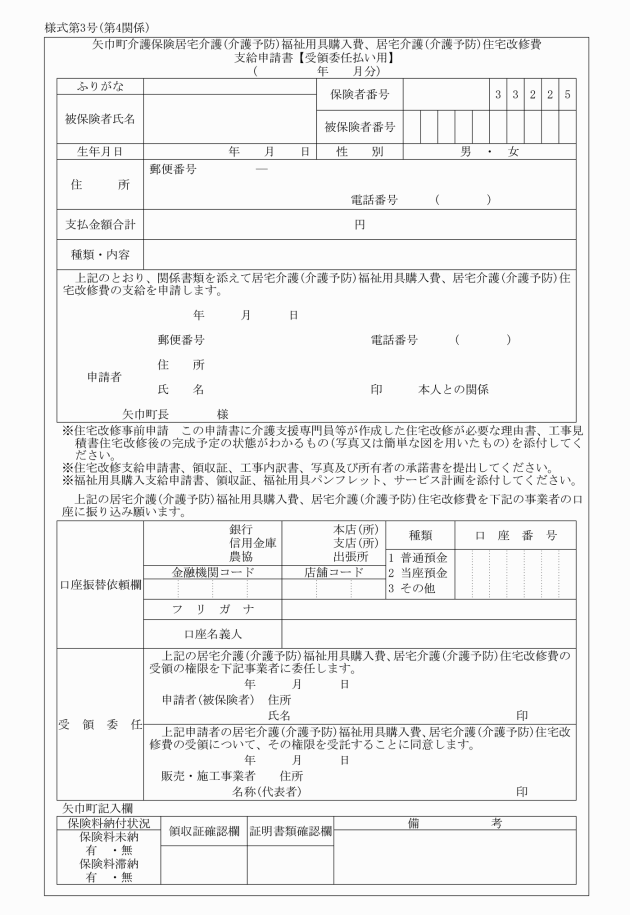 第3 受領委任を受諾する事業者は、矢巾町介護保険福祉用具購入費・住宅改修費受領委任受諾事業者届出書(様式第1号)を町長に提出するものとする。