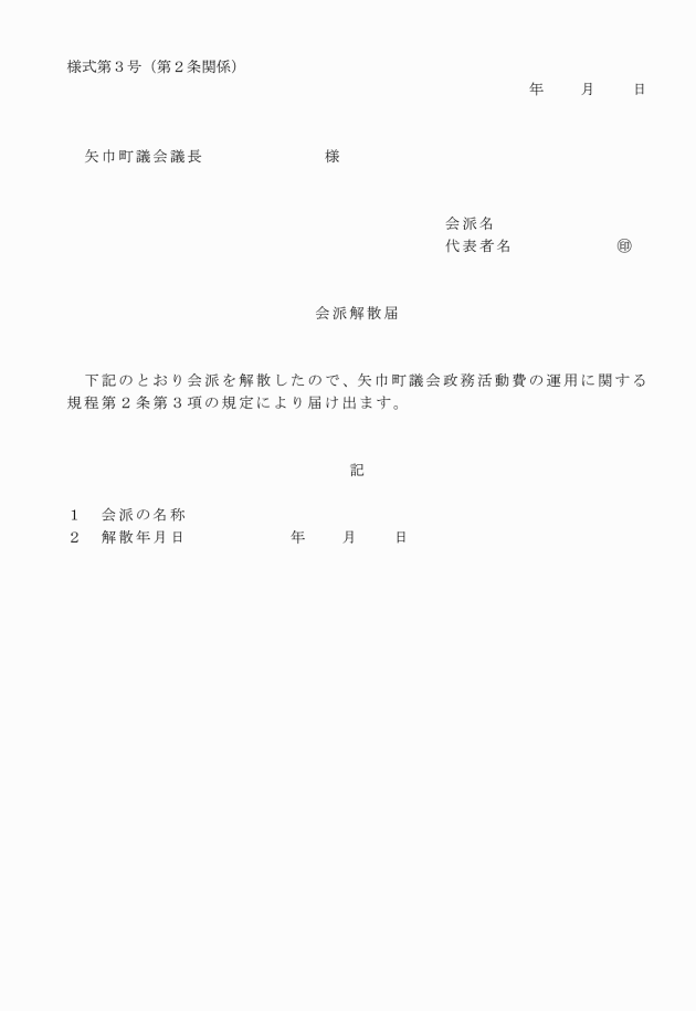 3 会派の代表者は、会派を解散したときは、会派解散届(様式第3号)により議長に届け出なければならない。