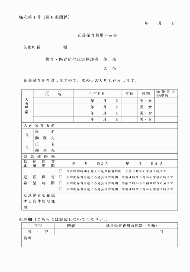 第6条 延長保育を希望する教育・保育給付認定保護者(子ども・子育て支援法第20条第4項に規定する教育・保育給付認定保護者をいう。以下同じ。)は、延長保育の開始を希望する日の属する月の前月の末日までに、延長保育利用申込書(様式第1号)を町長に提出しなければならない。