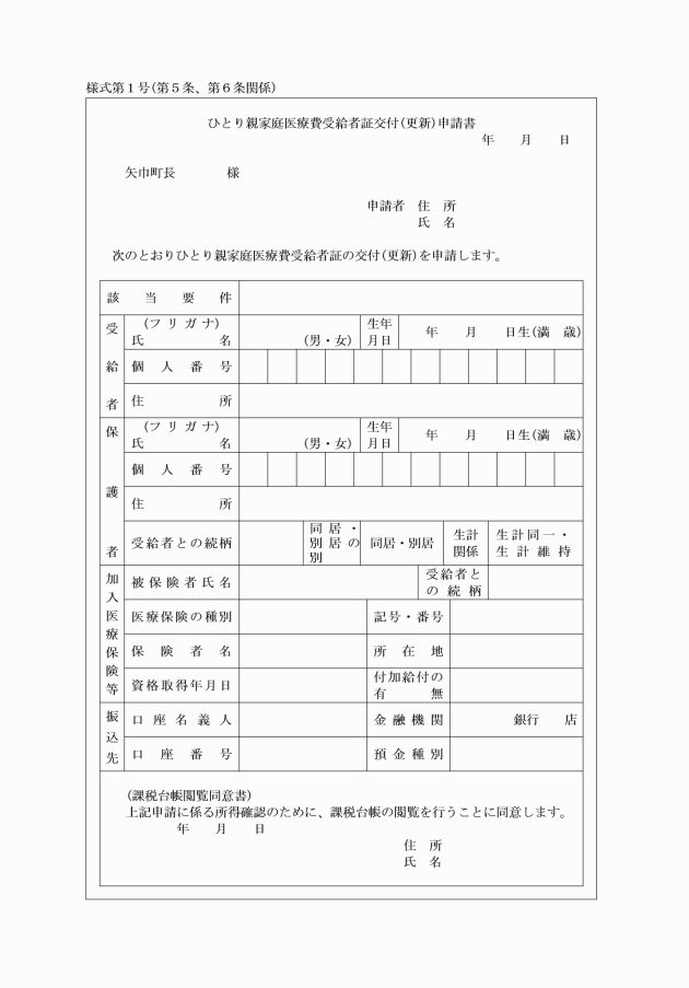 第12条 受給者等は、この告示による給付を受けようとするときは、医療機関等に医療保険各法に規定する一部負担金を支払った上、ひとり親家庭医療費給付申請書(様式第7号)を医療機関等から医療機関等記入欄の記載を受け、町長に提出しなければならない。