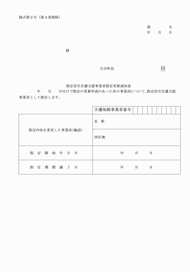 第3条 法第79条第1項の規定による申請は、施行規則の規定に基づき厚生労働大臣が定める様式(令和5年厚生労働省告示第331号。以下「様式告示」という。)別紙様式第二号(一)に、町長が必要と認めた書類を添付して行うものとする。