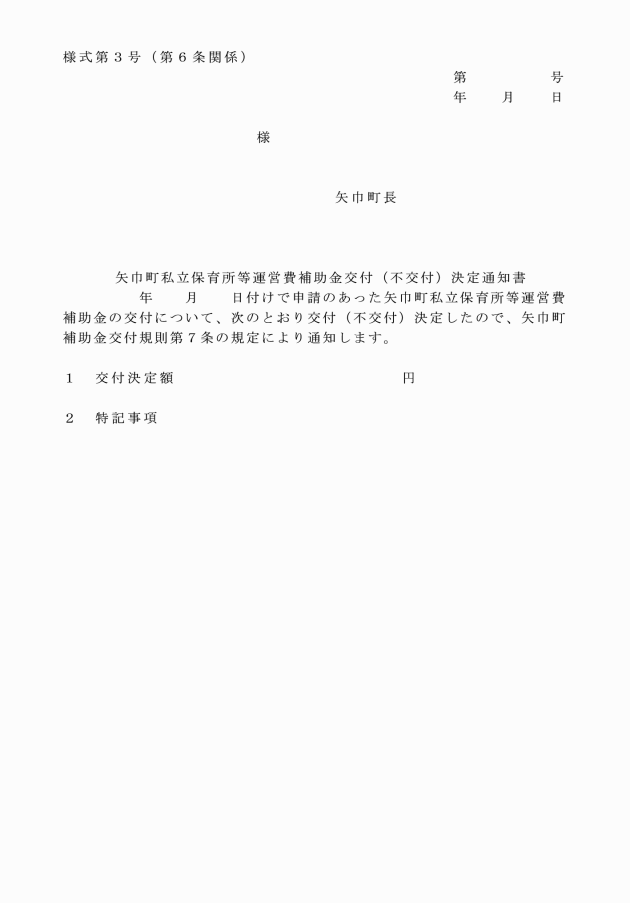 第8条 町長は、規則第6条第1項第1号から第3号までの規定による申請を受理したときは、その内容を審査の上、矢巾町私立保育所等運営費補助金変更(中止・廃止)承認決定通知書(様式第5号)により補助事業者に通知するものとする。