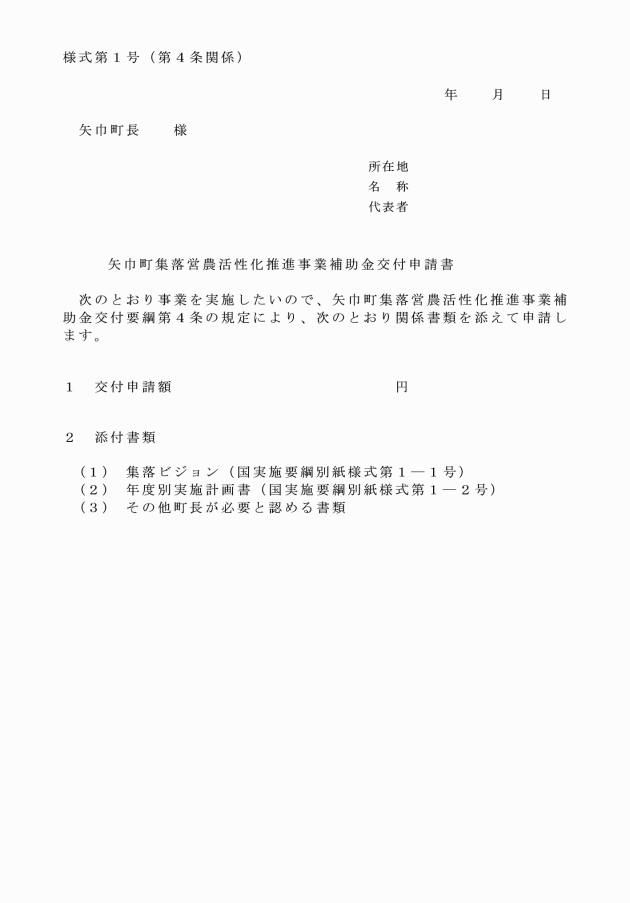 第4条 補助金の交付を受けようとする者(以下「申請者」という。)は、矢巾町集落営農活性化推進事業補助金交付申請書(様式第1号)に次に掲げる書類を添えて町長に提出するものとする。