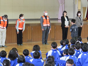 また、同日には、1・2年生の防犯教室も行いました。最近は、本校学区で「声がけ事案」は発生していませんが、全国では被害にあっている児童が多数あります。「い・か・の・お・す・し」の確認をした後、ロールプレイと言って、指導員の方が不審者役をして、実際に声をかけられる練習をしました。不審者に近づくと腕を取られ、そのまま車に乗せられることもありますから、不審者に近づかないことが一番大切であることを学びました。