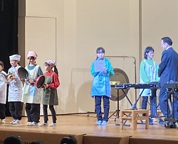 コンサート1部では、スーザマーチメドレーから始まり、主にパート紹介を行いました。各パートの楽器の特徴の紹介をした後、楽器の音を鳴らしてみるのですが、その際、4年生の寸劇が入っておりとても愉快でした。水戸黄門様、ルパン三世、ウルトラセブンとバルタン星人など、いろいろなキャラが登場しました。4年生の演奏もとても立派でした。司会の二人は笑顔がとても素敵で良かったです。