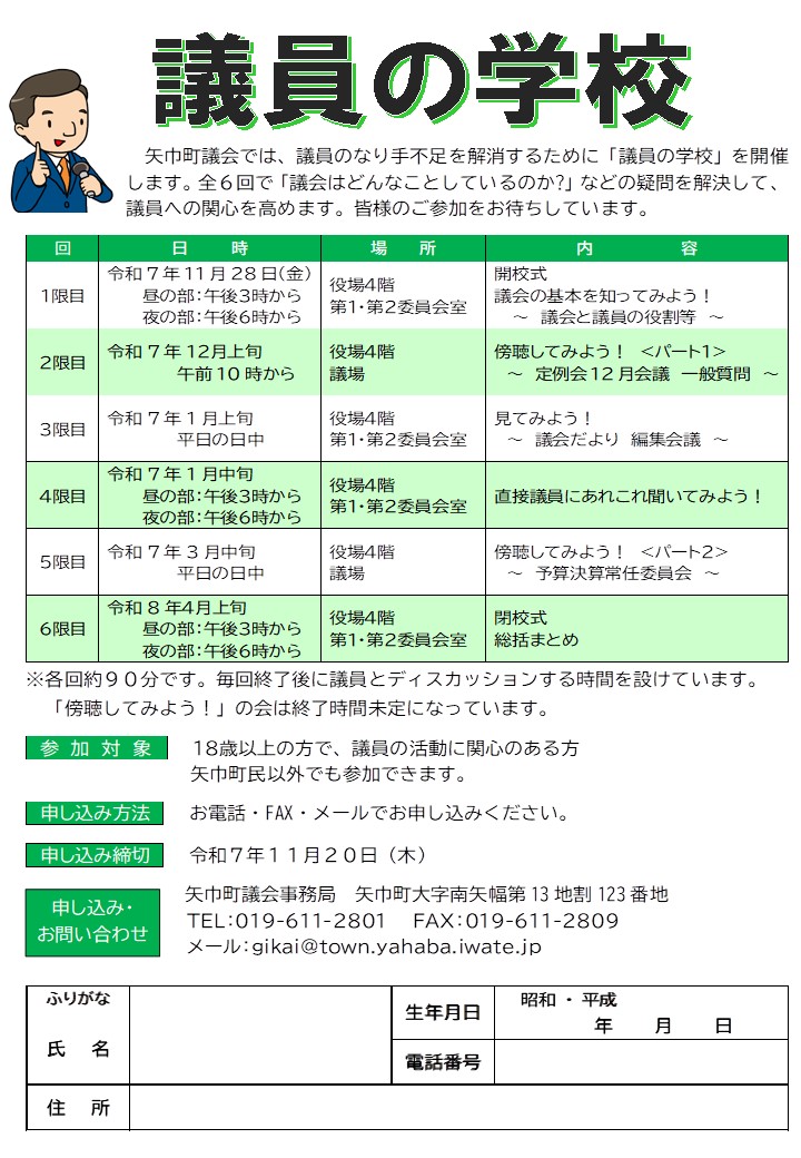 令和7年度議員の学校を開催します。 ぜひご参加ください。 令和7年度議員の学校チラシ兼申込用紙(PDF版) 令和7年度議員の学校チラシ兼申込用紙(Word版)