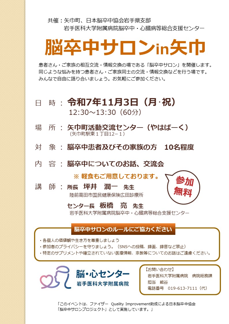 岩手医科大学では、脳卒中の当事者やその家族の情報交換・交流を目的とした「脳卒中サロン」を開催します。お気軽にお申込みください。