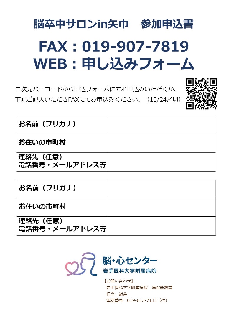予約 | 下記のいずれかの方法で10月24日(金)までに予約をお願いします。 【予約先:岩手医科大学附属病院】 ・電 話:019-613-7111(平日8:30~17:00) ・FAX:019-907-7819 ・申込みフォーム:こちら |